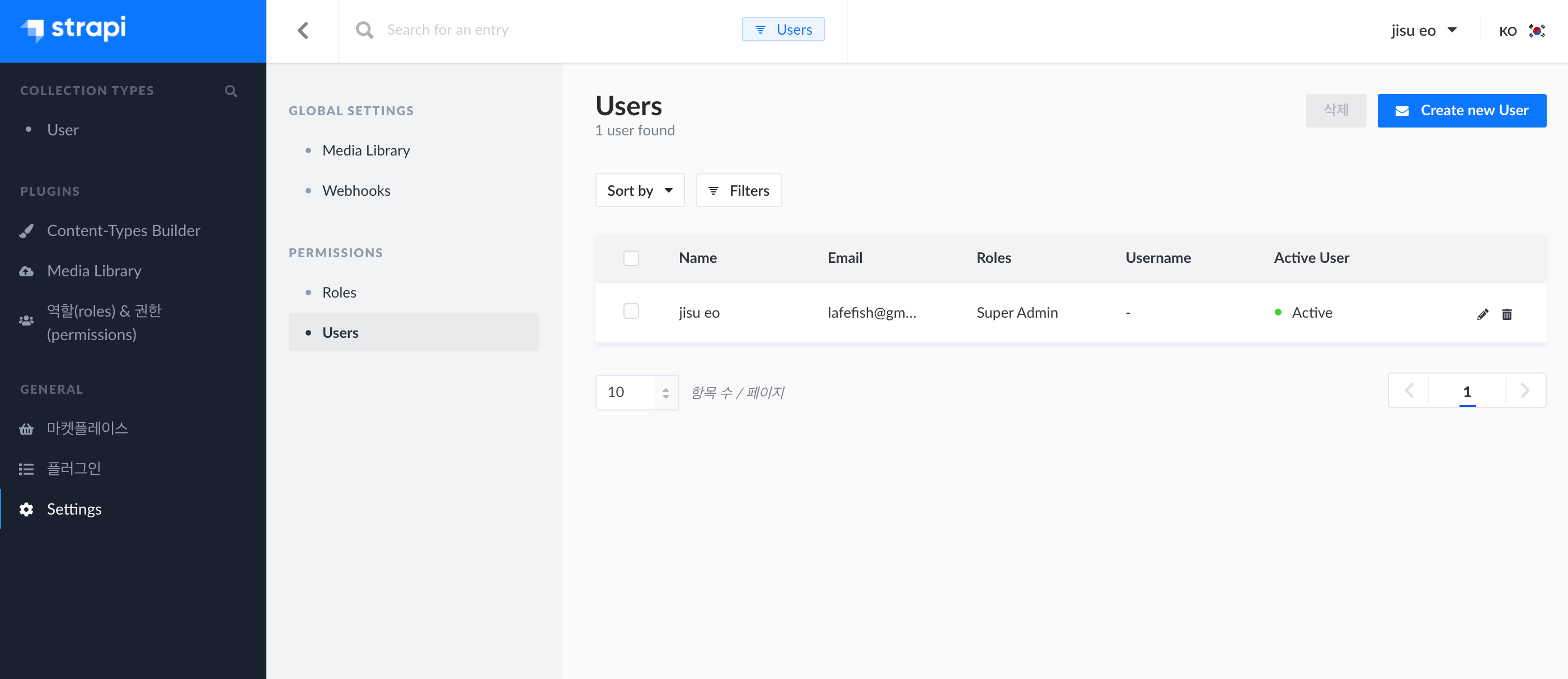 아무런 설정을 하지 않았지만 User라는 Collection types라는 것이 존재하는 것을 볼 수 있다. Collection Type은 DB의 테이블로 보면된다. 기본적은 strapi(Quick Start) cli를 사용해서 생성해 내면, user db가 자동 생성된다. 하지만 이 user db 는 아까 설정한 Dashboard admin 과는 다른 데이터와 api로서 사용되는 User이다. 그래서 처음에 admin을 설정햇지만, 그 user는 리스트에서 보이지 않는 다는 걸 알 수 있다. 처음 설정한 admin은 흡사, mysql에 root계정 같은 관리자 계정이다.