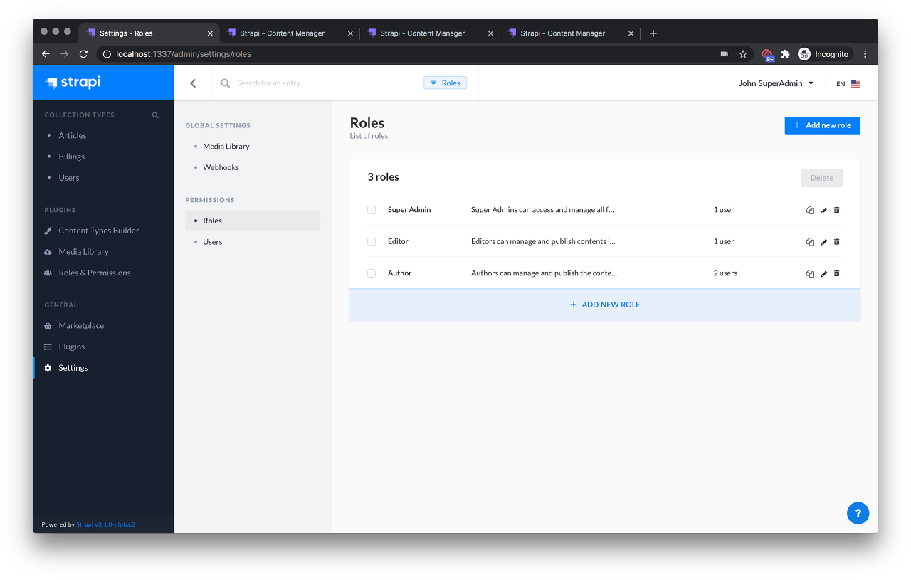 Settings-Permissions-Users에서 Admin user를 추가 하거나, 그 권한을 설정 할 수 있다. 여기서 부터 유료 버젼과 무료 버젼의 차이가 생기게 되는데, Admin user의 Role를 생성하는 것이 무료 버젼에서는 한계가 있다. 아래 그림에서 볼 수 있는 것과 같이 3가지 이외 더이상의 role은 무료버젼에서는 추가 할 수 없다.