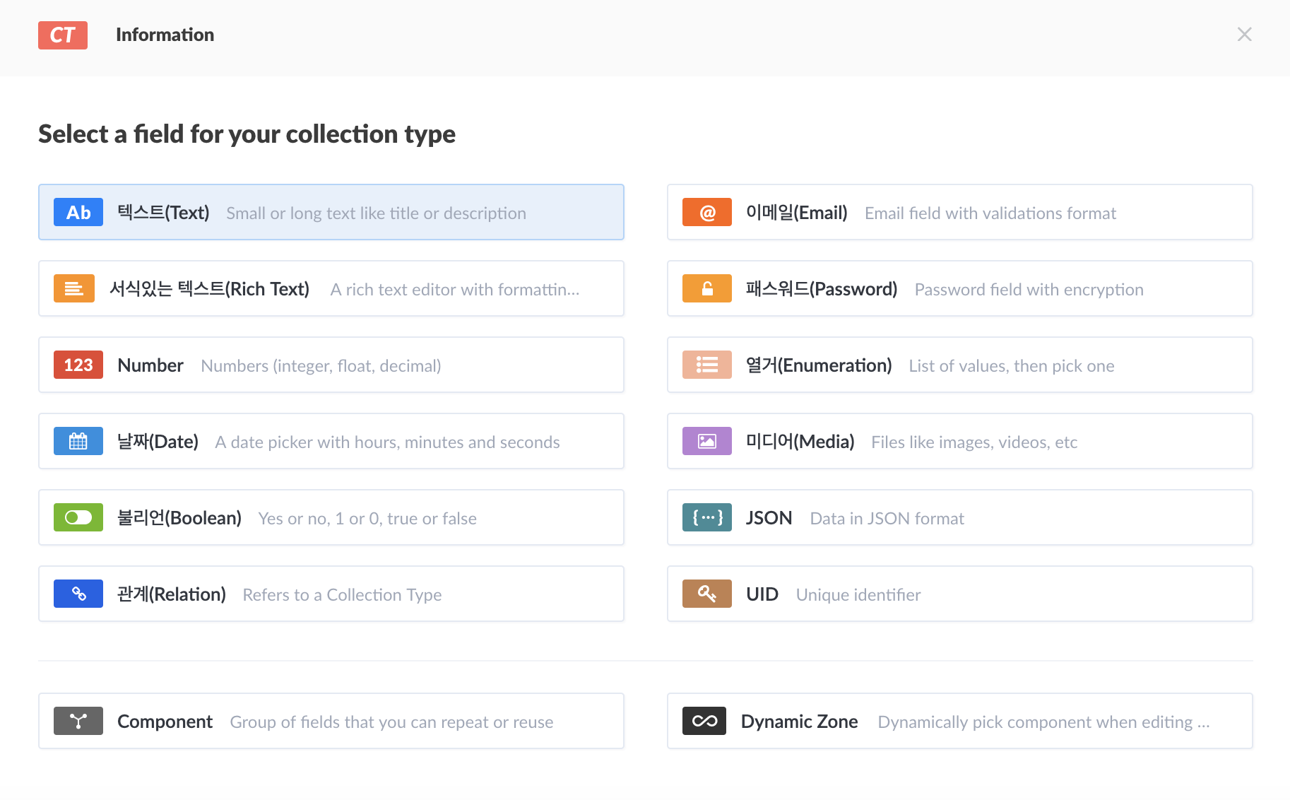 - Component, Dynamic은 기본적인 Column이 아닌 strapi에서 사용하는 특수한 타입으로 기존의 DB들이 가지고 있는 Column은 아니며, UI 등을 표현하기 위한 방편으로 사용되는 Field타입니다.(차후 다른 글로 설명)