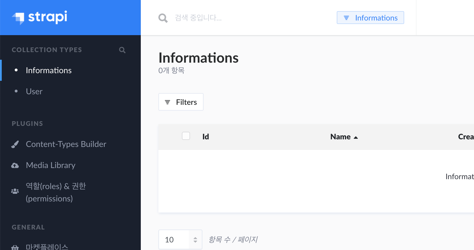 - 현재 Information이라는 이름의 Collection Type(Table)을 만들고 name이라는 text type의 field를 추가 하는 화면이다.