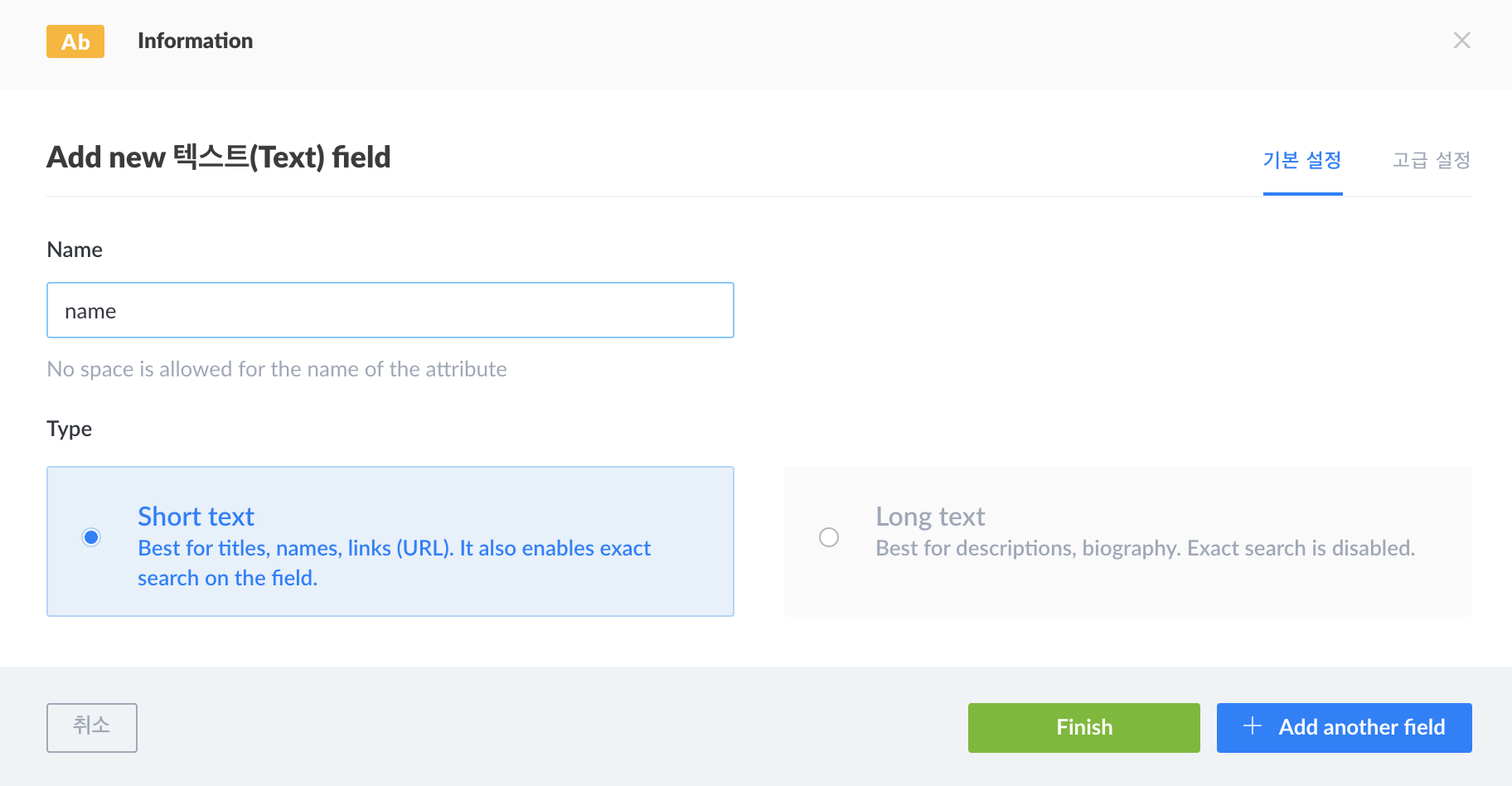 - 현재 Information이라는 이름의 Collection Type(Table)을 만들고 name이라는 text type의 field를 추가 하는 화면이다.