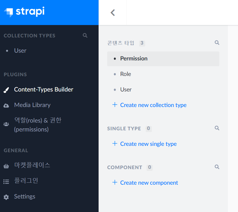 PLUGINS/Content-Types Builder를 누른후 나타나는 오른쪽 화면에서 + Create new collection type 을 클릭한다.