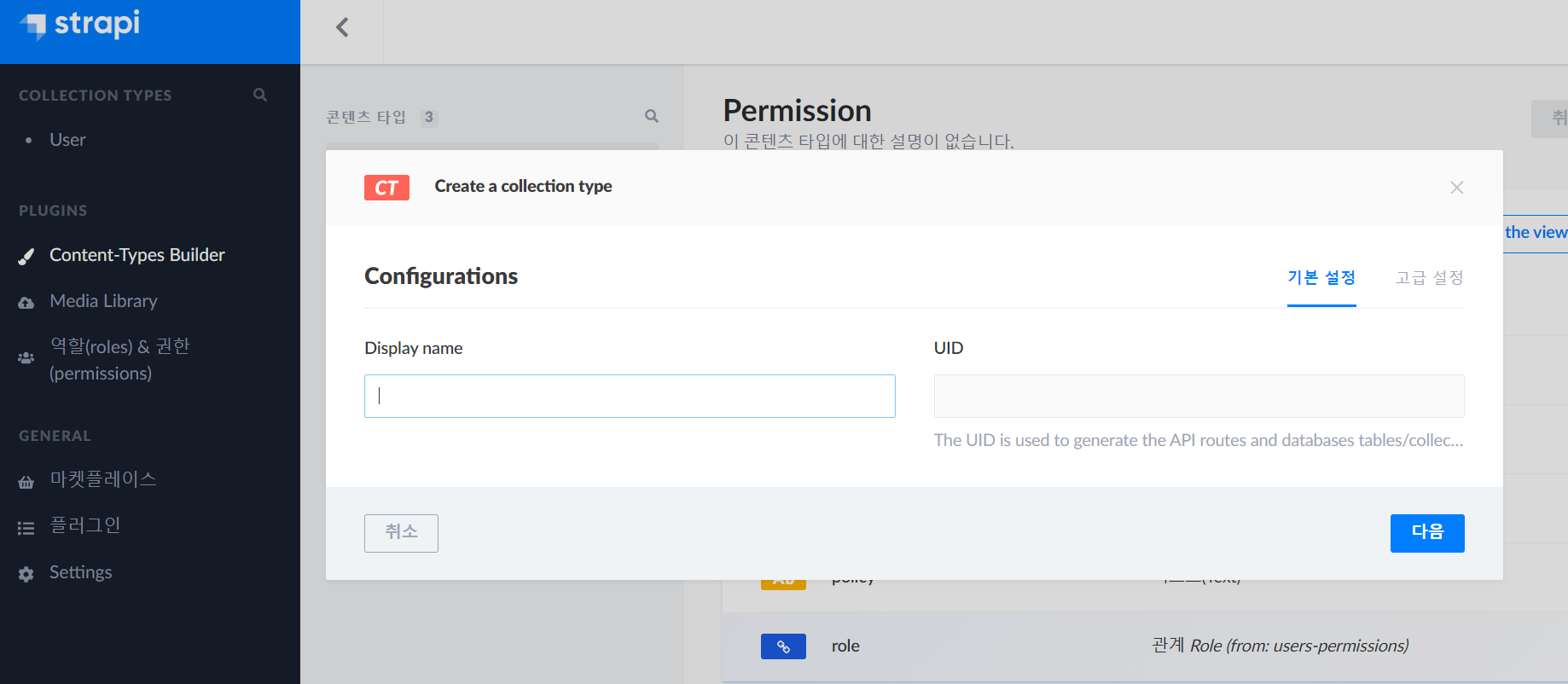 collection type의 이름을 설정한다. 이 이름은 table name이라고 생각할 수 있다. 다만 Display name은 현재 strapi에서 보여지는 이름이며 고급 설정에 실제로 DB table이름으로 사용될 collection name도 따로 설정은 할 수 있다.
