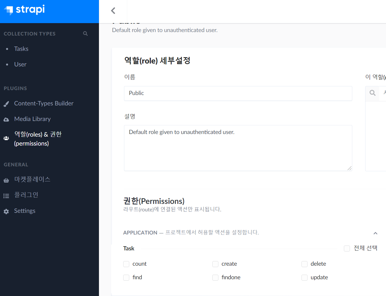 Public 설정 화면에 들어 가면 위와 같이 원래 업던 Task라는 항목이 생성되어 있음을 확인 할 수 있따. 새부적인 권한을 설정 할 수 있다.