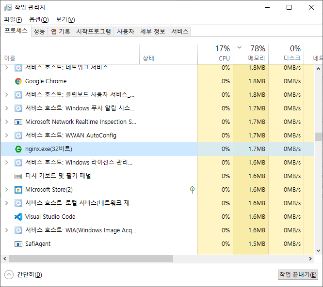 - 또는 Windows 작업 관리자에서 nginx.exe가 실행 중 인지 확인 할 수 있다.