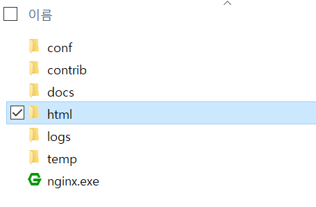 아래 그림에서 볼수 있는 것과 같이 nginx.exe와 같이 html directory가 있습니다.