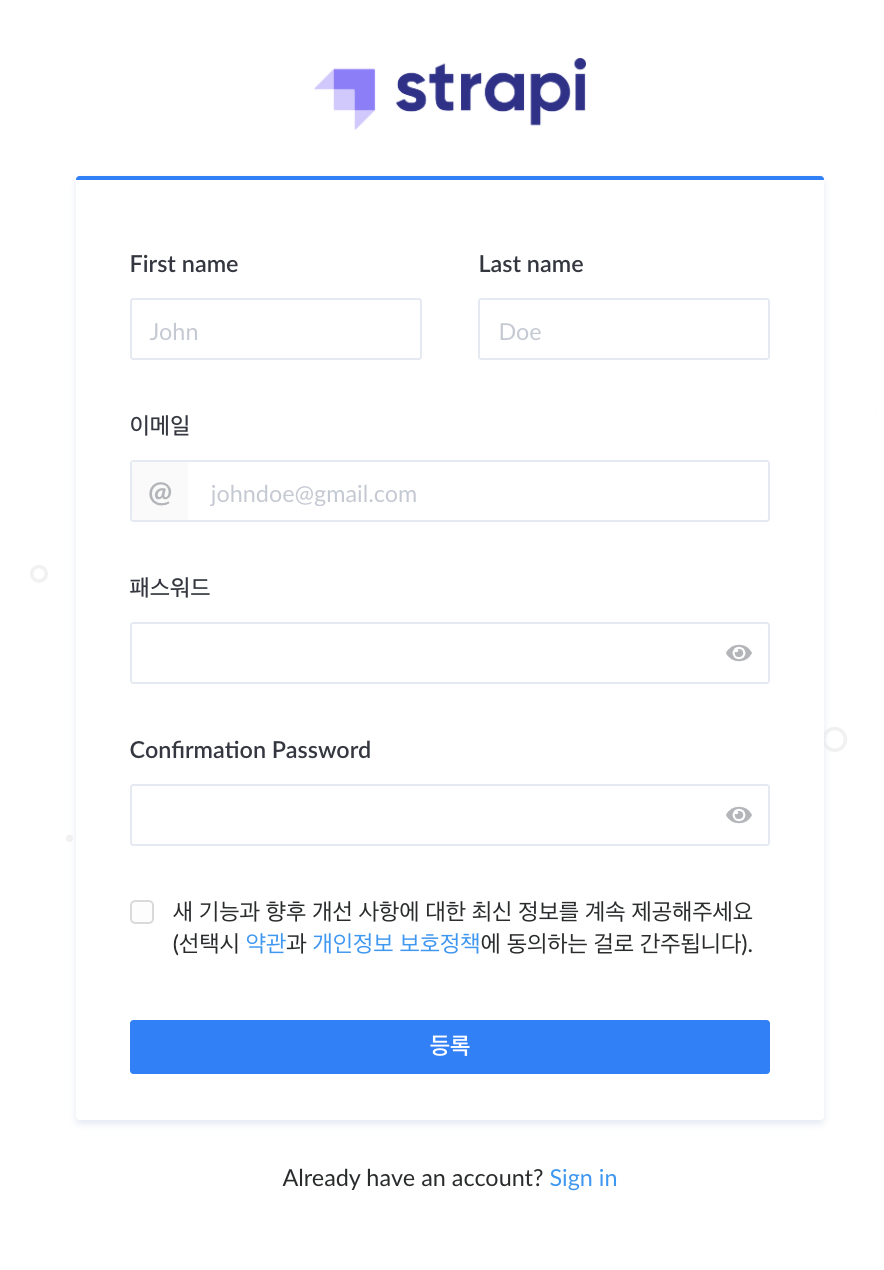 다음에는 strapi의 admin 설정과 admin dashboard 에서 데이터를 디자인하고 api 를 사용하는 방법에 대하여 알아 보도록 하겠다.